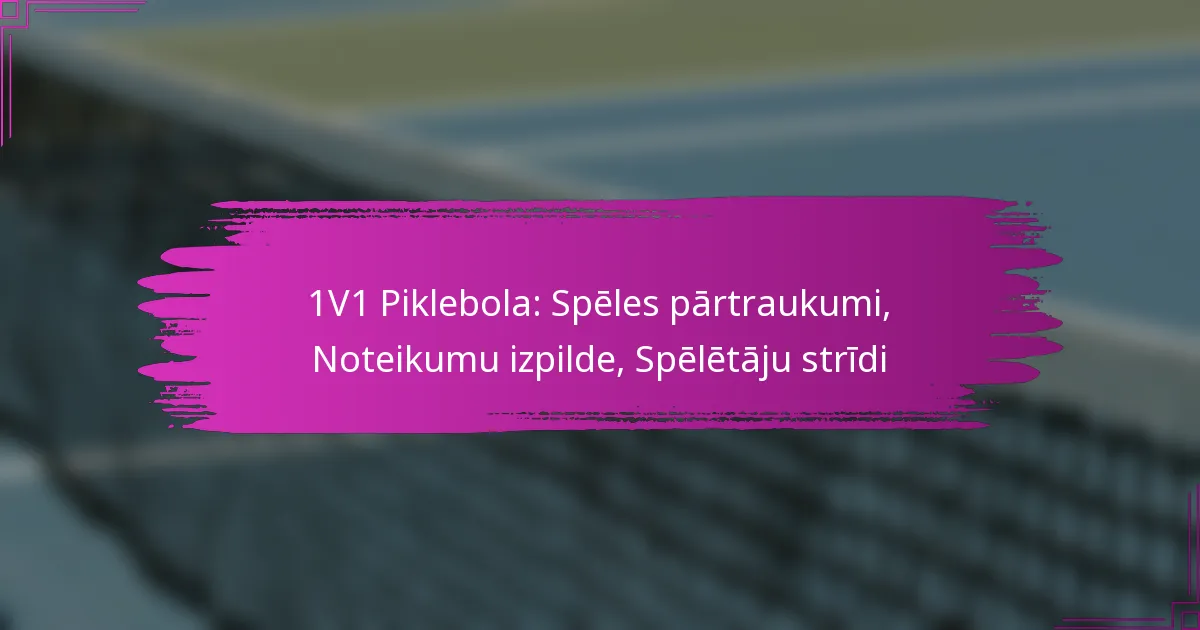 1v1 piklebola spēlē spēles pārtraukumi var rasties dažādu faktoru dēļ, piemēram, traumu, ārēju traucējumu un aprīkojuma problēmu dēļ, tāpēc spēlētājiem ir būtiski efektīvi pārvaldīt šos pārtraukumus. Noteikumu izpilde balstās uz pašregulēšanu un, kad tas ir iespējams, tiesnešiem, kas prasa, lai spēlētāji būtu labi iepazinušies ar oficiālajiem noteikumiem, lai risinātu strīdus. Skaidra komunikācija un strukturētas konfliktu risināšanas stratēģijas ir vitāli svarīgas, lai atrisinātu nesaskaņas, veicinot godīgu un patīkamu spēli visiem dalībniekiem.